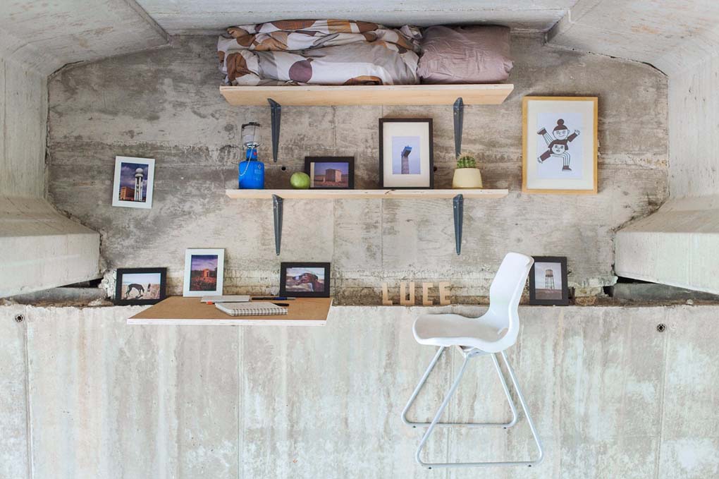 因為選址的特殊,工作室勢必無(wú)法太精致,還要努力和周?chē)沫h(huán)境融為一體,達到隱蔽的目的。但是Fernando Abellanas在設計上用了很多巧思,將書(shū)柜和桌椅直接固定在天橋的墻壁上,并擺上相框、小盆栽等等,簡(jiǎn)陋的條件下,竟也有“工作室”的模樣,甚至有點(diǎn)小清新。